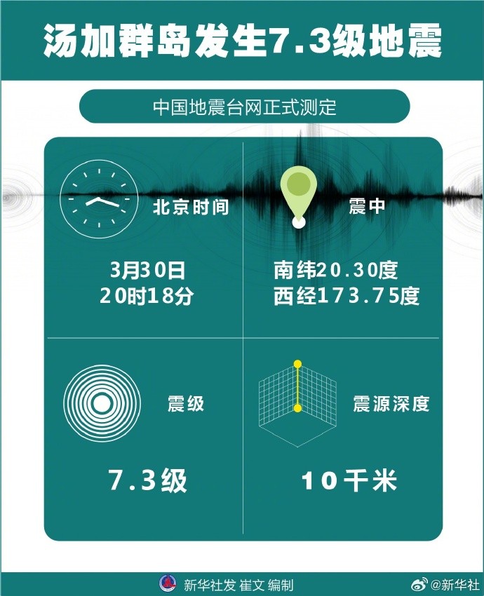 圖源新華社 美國地質調查局及中國地震台網當日迅速發布數據,確認震央位於湯加龐艾鎮東南面約127公里處,地理坐標為南緯20.56度、西經173.42度。太平洋海嘯預警中心隨即發出海嘯警報,警告震中300公里範圍內的海岸線可能受到危險海嘯波影響,包括湯加主島湯加塔布島。 據中國地震台網正式測定,地震震源深度僅10公里,屬淺層地震,潛在破壞力較強。美國地質調查局則錄得震源深度為58.6公里,顯示不同機構測量結果略有差異,這可能與地震波傳播及監測設備差異有關。湯加位於太平洋“火環帶”上,地質活動頻繁,此次地震是該地區近期的一次顯著事件。 太平洋海嘯預警中心在地震發生後約15分鐘發出警報,指海嘯波可能於當地時間凌晨1時18分後影響湯加沿岸,並呼籲民眾撤離低窪地區至高地避險。湯加氣象部門隨後建議居民保持警惕,收聽廣播更新。中國自然資源部海嘯預警中心快速響應,初步研判認為此次地震引發的海嘯不會對中國沿海構成顯著影響,因湯加距中國東岸超過7000公里,海嘯能量在遠距離傳播中將大幅衰減。 湯加當局尚未報告具體傷亡或財產損毀情況。綜合外媒報道,地震發生於當地時間凌晨,尚無損壞報告,但海嘯威脅令人擔憂。專家指出,湯加位於太平洋板塊與印澳板塊交界,屬高地震風險區,過去如2022年11月7.3級地震及2022年1月火山海嘯均顯示其脆弱性。 湯加人口約10.5萬,多數居住於主島湯加塔布島,距離震央約200公里。(完) 【編輯:林曉惠】