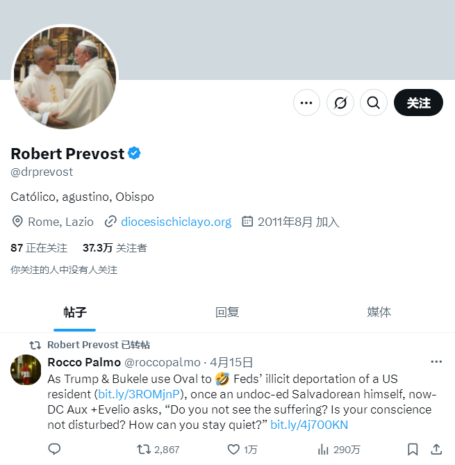一個名為“普雷沃斯特”的X賬號截圖 該賬戶創建於2011年,當時X還被稱為推特(Twitter),其大部分帖子都是各種文章的轉發,而非原創文本或內容。截至發稿(5月9日15時許),粉絲已超37萬。 目前,多家媒體聯繫梵蒂岡、X賬戶以及普雷沃斯特的朋友等,但無法獨立確認該X賬戶是否與新當選的教皇利奧十四世有關。白宮亦未就相關貼文發表評論。 儘管該賬號的使用者還未能證實是新教皇普雷沃斯特,但輿論已經認為普雷沃斯特可能是特朗普政府的批评者。除了美國媒體,歐洲媒體亦大肆報道相關內容。 英國路透社(Reuters)報道稱,普雷沃斯特捲入了美國分裂政治的漩渦,其社交媒體上的言論令“讓美國再次偉大(Make America Great Again,是特朗普競選時的口號)”運動支持者很不高興,“他們對普雷沃斯特的任命表示蔑視”。 法國世界報(Le Monde)亦報道稱,普雷沃斯特的當選在美國媒體上引發了一股愛國主義浪潮,但他本人并未受到特朗普支持者的特別青睞。 德國《明鏡周刊》(Spiegel online)認為,這位教皇很可能與特朗普政府發生衝突。報道還注意到,普雷沃斯特的就職演說是以流利的意大利語完成的,穿插了幾句西班牙語,而對出生地美國,他未置一詞,甚至未用母語英語發言。(完) 【編輯:丘志彬】