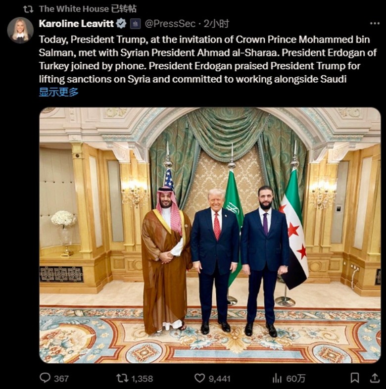 5月14日,特朗普與沙拉(右一)在沙特舉行會晤。圖自社媒,推文截圖 “埃爾多安讚揚特朗普解除對叙利亞的制裁,并承諾與沙特攜手合作,促進叙利亞的和平與繁榮。穆罕默德讚揚特朗普解除制裁的決定,稱其勇氣可嘉,”萊維特稱,“特朗普感謝埃爾多安和穆罕默德的友誼,并告訴沙拉,他擁有在叙利亞做出歷史性成就的絕佳機會。” 萊維特表示,特朗普鼓勵沙拉為叙利亞人民做出偉大貢獻,同時向他提出5點要求:與以色列簽署旨在促進關係正常化的《亞伯拉罕協議》(也稱以哈和平協議)、要求所有外國恐怖分子離境、驅逐巴勒斯坦恐怖分子、幫助美國阻止“伊斯蘭國”死灰複燃、負責管理叙利亞東北部的ISIS拘留中心。 沙拉感謝三人為促成此次會晤所付出的努力,承認伊朗撤離叙利亞帶來“重大機遇”及美叙在打擊恐怖主義和消除化學武器方面的共同利益,并重申他對1974年與以色列部隊脫離接觸的承諾。 新聞稿稱,在會晤中,沙拉向特朗普提出,他希望叙利亞成為促進東西方貿易的關鍵紐帶,并邀請美國公司投資叙利亞的石油和天然氣。