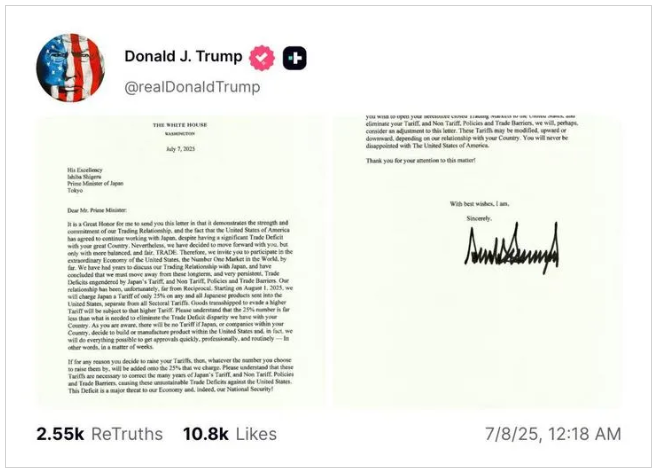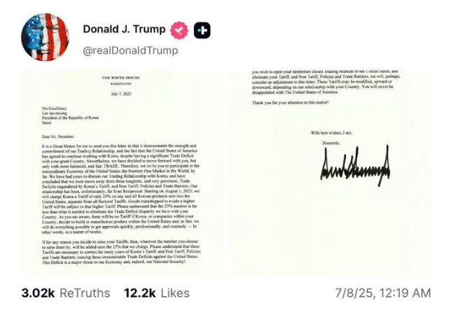 當地時間7月7日,美國總統特朗普在社交媒體平台上發佈了致日本首相石破茂、韓國總統李在明的信件,宣布美國將自2025年8月1日起對所有日本和韓國輸美產品征收25%的關稅。