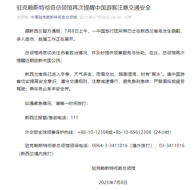 圖片來源:“中國駐克賴斯特徹奇總領館”微信公眾號截圖 中國駐克賴斯特徹奇(基督城)總領館表示,將密切關注傷者救治情況,並及時提供領事服務與協助。 總領館再次提醒近期旅新中國公民:新西蘭南島已進入冬季,天氣多變,雨雪交加,路面濕滑,時有“黑冰”。請中國遊客切實提高安全意識,遵守交通規則,注意減速慢行,避免急剎急轉;嚴禁酒後或疲勞駕駛;乘車務必系牢安全帶(完) 【編輯:林曉惠】