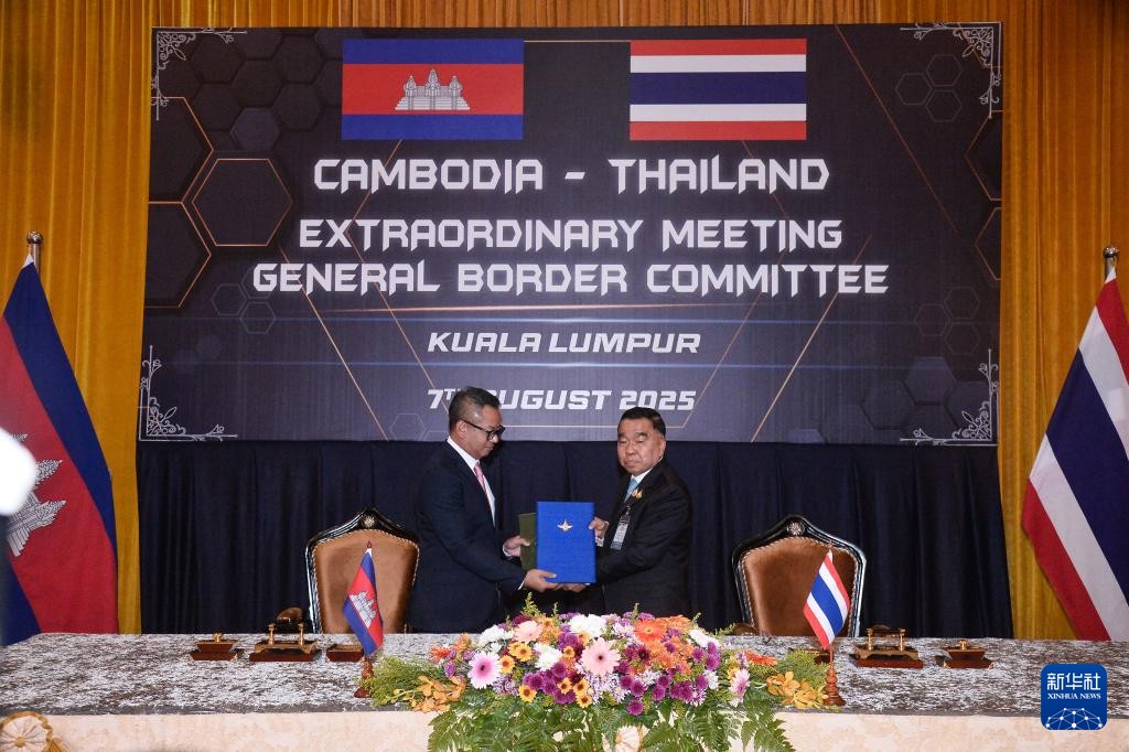 8月7日,在馬來西亞吉隆玻,柬埔寨副首相兼國防大臣迪西哈(左)和泰國國防部副部長那達蓬·那帕尼展示簽署的協議。(新華社發) 柬埔寨方面說,雙方對停火安排進行了詳細磋商,支持建立區域監督機制,恢復兩國互信。雙方同意遵照國際人道主義法對待被俘士兵。 泰國方面說,雙方已達成停火協議並將保持順暢溝通,通過雙邊機制解決問題。雙方同意東盟成員國等監督兩國落實停火情況。 據了解,雙方還一致同意一個月內舉辦下一次兩國邊界總委員會特別會議。 據報道,當天出席會議的,還包括馬來西亞、美國和中國的觀察員。 柬埔寨和泰國7月24日在邊境地區發生衝突,雙方互相指責對方違反國際法。在馬來西亞總理安瓦爾主持下,兩國於7月28日舉行會談並同意從當日24時起“立刻且無條件”停火,並約定召開泰柬邊界總委員會會議以推動恢復邊境地區和平與穩定。(完) 【編輯:淩玉輝】