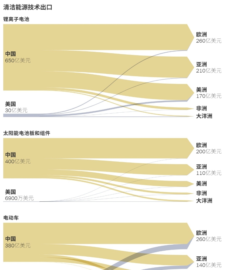聯合國商品貿易數據庫2023年清潔能源技術出口數據(圖源:紐約時報) “中國低碳技術對美國的領先優勢已不可逆轉” “特朗普的能源策略與中國形成鮮明對比,中國是世界上最大的煤炭消費國,也是最大的碳排放國。然而,幾十年來,中國投入了大量資源來製造可再生能源和清潔能源技術,結果是,現在中國已經能够控制這些尖端系統的全球市場。” 克里斯蒂娜說。 《紐約時報》觀點作家大衛·華萊士認為,中國人正在成為矽谷未來學家喜歡稱之為“世界上第一個電力國家”的道路上。“如同俄羅斯天體物理學家所描述的‘第一類文明’,這是一種能够利用地球上所有天然可用能量的技術文化。” 克里斯蒂娜表示,從數字上看,中國在可再生能源和清潔能源技術領域的主導地位是巨大的。“根據國際能源署的數據,如今,中國控制著全球太陽能電池板供應鏈的80%以上,并已投資超過500億美元用於新的光伏供應能力,是歐洲的10倍。中國幾乎占全球風能、太陽能和電池能源製造能力的至少60%,2024年安裝的風力渦輪機和太陽能電池板比世界其他地區的總和還要多。” 國際能源署預計,到2035年,太陽能和風能預計將成為超過煤炭和天然氣的兩大電力生產來源。而專家分析認為,中國價格低廉的太陽能、電池和電動汽車使許多大型經濟體轉向清潔技術成為可能,這種可負擔性對於降低全球排放至關重要。克里斯蒂娜還援引氣候政策領域資深專家,智庫亞洲協會政策研究所(ASPI)中國氣候中心主任李碩的觀點認為,“目前,中國在太陽能、風能和電池等重要低碳技術方面已經建立了與美國相比的重要且不可逆轉的領先優勢。”(完) 【編輯:馮赫棠】
