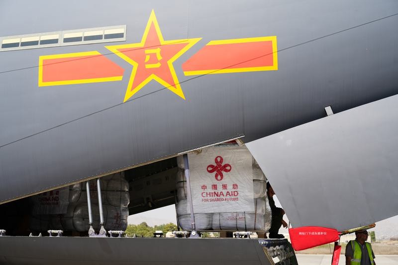 9月7日,在阿富汗喀布爾,工作人員從中國空軍運-20飛機上卸載援助阿富汗的救災物資。圖片來源:新華社