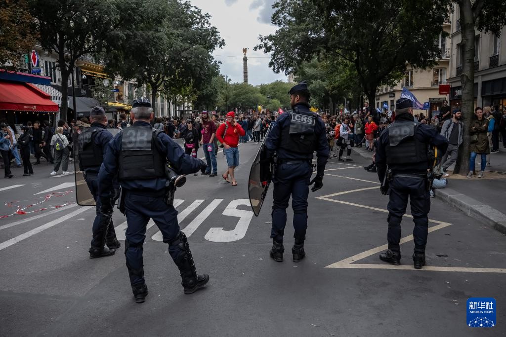 9月10日,法國多座城市10日發生“封鎖法國”大規模游行示威,抗議前任總理貝魯此前提出、旨在削減財政支出的預算草案。圖為在法國巴黎街頭,警察在法國巴黎夏特萊廣場附近的游行示威現場警戒。新華社圖片