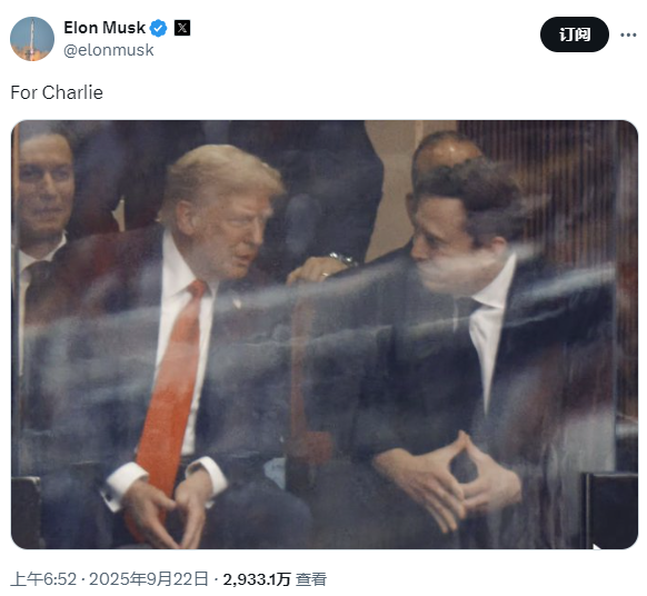 截圖自馬斯克社交平台 白宮官方賬號也上傳了同一時刻拍攝的背面合照,並附上“美國總統與馬斯克”以及“獻給查理”的字眼。