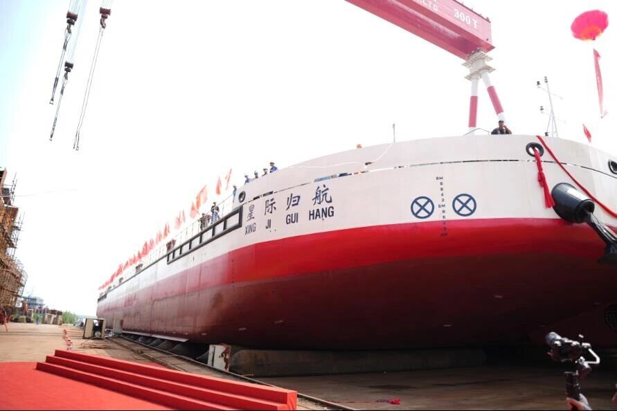 中國造船業不斷發展,2025年8月5日,全國首艘、世界第二艘新建的運載火箭回收船順利下水(採訪對象供圖)