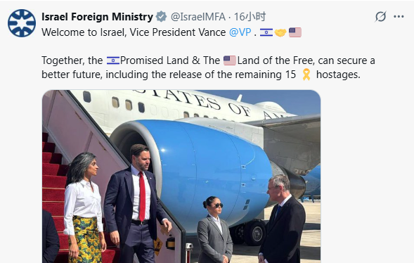 圖片來源:以色列外交部X平台賬號截圖 以色列外交部在X平台上發布了萬斯抵達該國的消息,並配上了萬斯和其妻子走下飛機的照片。 《以色列時報》稱,萬斯此次訪問以色列的任務之一是監督加沙停火協議執行情況。萬斯將在22日與內塔尼亞胡和以色列總統赫爾佐格會晤。 此前,以色列總理辦公室發言人20日通報,內塔尼亞胡當天會見了到訪的威特科夫和庫什納,討論了地區最新事態發展。 內塔尼亞胡20日晚些時候在面向議會的講話中說,美國副總統萬斯定於21日抵達以色列,雙方屆時將討論以色列面臨的安全挑戰和外交機遇。 以色列與哈馬斯達成的停火協議目前面臨考驗。以軍19日空襲和炮擊加沙南部拉法地區,稱哈馬斯違反停火協議。以色列總理辦公室說,內塔尼亞胡下令採取“強有力的行動”。哈馬斯否認發動襲擊,指認以方編造理由企圖重啟戰事。 特朗普20日警告稱,如果哈馬斯違反停火協議,將被“消滅”,他仍將給加沙局勢“一點機會”。(完) 【編輯:林曉惠】