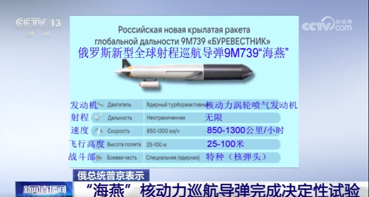 俄羅斯宣布成功試射“海燕”核動力巡航導彈。央視新聞圖片 里特說:“為了免受‘海燕’的攻擊,美國必須建造一個完全不同的360度防空系統,以保護美國領土。我們沒有深思熟慮的構想和建造這種系統的資金。” 他指出,“海燕”導彈可以在飛行中靈活機動,從而繞過導彈防禦系統。此外,“波塞冬”潛航器是水下發射,這使得攔截變得更加困難。他認為,“金穹”系統的根基遭到動搖。 俄羅斯總統普京10月29日表示,不久前俄成功試射帶有核動力裝置、飛行距離無限的最新式巡航導彈“海燕”。 普京還透露,俄水下無人潛航器“波塞冬”已接受測試,它同樣具有核動力裝置;俄方首次用“起動發動機”把“波塞冬”從潛艇上成功射出,並且開啟核動力裝置讓該潛航器航行了一段時間。“從‘波塞冬’的運行速度和深度來看,目前沒有與之類似的無人潛航器,這款潛航器目前無法被攔截。”他還表示,這種無人潛航器可以攜帶常規和核彈藥,使它能夠打擊各種目標,包括航母編隊、海岸防禦工事和基礎設施。(完) 【編輯:馬華】
