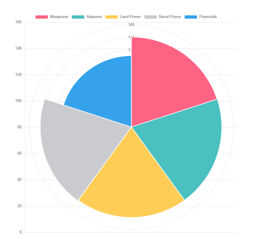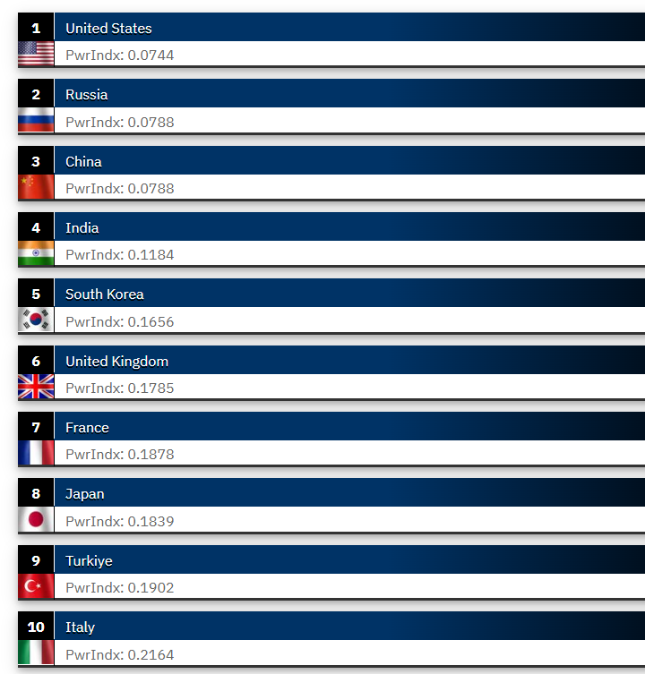 (Global Firepower評估的中國其中的六大指標。圖源:Global Firepower) 上圖旨在一目瞭然地顯示相對固有的優勢和劣勢,分數是 GFP 年度排名中相關類別的平均值:1) 人力包括現役、預備役和為國家確定的任何官方準軍事部隊;包括來自每個服務部門的人員(紅色區域)。2)空中力量包括製造戰爭的空中系統,不包括教練機和無人機(綠色區域)。3) 陸地力量包括機動/機械化車輛要素以及牽引火砲和機械化/牽引多管火箭炮系統(黃色區域);4) 海軍力量包括服役船體,從藍水軍艦和潛艇到棕水巡邏資產(內陸國家除外)(灰色區域)。5)財務水平表現了當前世界舞台上的財務健康狀況(藍色區域)。 根據其網站最新發佈的數據,全球軍力前五強的國家為美國、俄羅斯、中國、印度和韓國。而根據網站資料顯示,中國至少連續十年獲得頂級GFP的排名,說明中國的軍事實力已是實質強國。