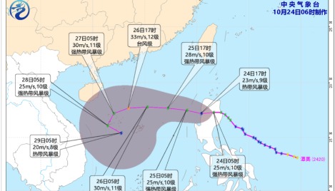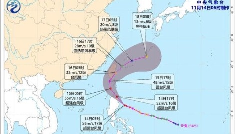 香港中通社11月24日電 今年第27號颱風“天琴”目前位於菲律賓東南方海域,該系統預計這兩天穿越菲律賓中南部群島,進入南海後繼續往西,朝中南半島前進。