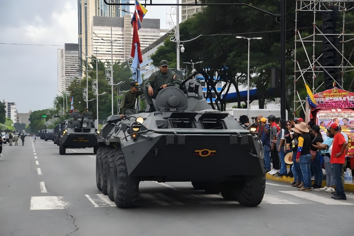9月23日,在委內瑞拉首都加拉加斯,參加游行的裝甲車輛列隊行進,呼籲保衛委內瑞拉主權與和平,反對美國在加勒比海域的軍事威脅。新華社發。