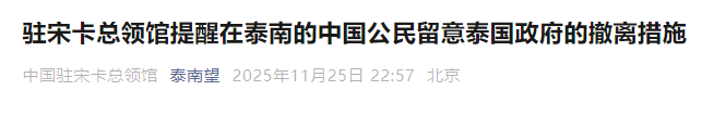 同一天(25日),中國駐泰國大使館發布公告,提醒在泰中國公民近期暫勿前往宋卡府合艾市等受災地區,做好安全防範和應對準備,確保生命財產安全,並密切關注當地發布的天氣預報和災害預警信息,遠離危險地帶,做好防災準備。