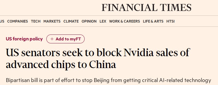 據英國《金融時報》日前報道,美國參議院外交關係委員會東亞小組共和黨主席皮特·里基茨與首席民主黨參議員克里斯·庫恩斯於4日聯合發起《安全可行芯片出口法案》。該法案要求美國商務部長在30個月內拒絕向中國發放先進芯片的出口許可證,這意味著英偉達向中國銷售其最先進的H200及Blackwell芯片將受到法律阻截。