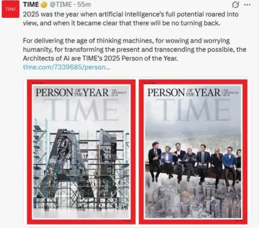 圖:《時代》社媒截圖 《時代》主編薩姆·雅各布斯在社論中指出:“年度人物是讓全世界關注那些塑造我們生活的人的有效方式。今年,沒有人比那些構想、設計和創造人工智能的人影響力更大。”他形容2025年是“人工智能全部潛力展現出來的一年”,並強調“無論問題是什麼,人工智能都是答案”,同時坦言這項技術“既令人驚嘆又令人擔憂”。 本期封面故事深入探討了AI在過去一年如何深刻改變全球社會、經濟與日常生活。雜誌特別製作了兩個封面,其中一個致敬1932年經典照片《摩天大樓頂上的午餐》,以象徵當代“AI建築師”正在構築數字時代的摩天大樓。 值得注意的是,《時代》自身也深度參與AI生態。2024年6月,該雜誌與OpenAI簽署多年內容授權協議,允許後者訪問其新聞檔案,使ChatGPT在回答用戶提問時可直接引用《時代》原文。此舉引發外界對媒體與科技公司邊界模糊的討論。 盡管AI發展伴隨爭議,《時代》仍認為其締造者已不可逆地重塑人類未來。正如雅各布斯所言:“不會有回頭路,也不會有退出選項。”這一評選不僅是對技術領袖的肯定,更是對全人類邁入AI紀元的正式宣告。(完) 【編輯:葉永成】