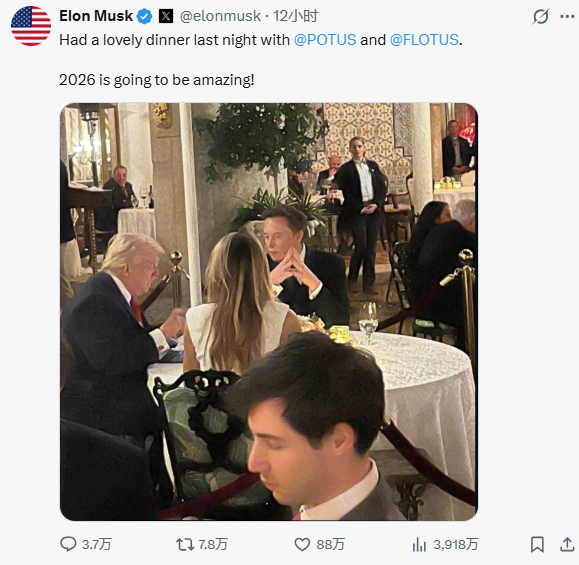 香港中通社1月5日電 美國企業家埃隆·馬斯克當地時間1月4日在X上發文稱,他昨晚(3日)與美國總統特朗普和美國第一夫人梅拉尼婭“共進美好晚餐”,並配上一張三人一起用餐的照片。
