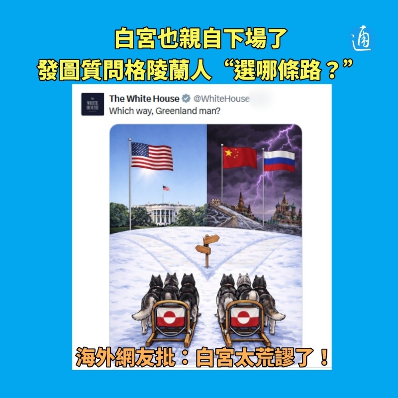 香港新聞網製圖 這條帖子中的圖片,設計別有用心:上方左側是美國國旗,右側是中國和俄羅斯國旗,背景分別選取了陽光普照的白宮,以及帶有閃電效果的俄羅斯建築和中國長城,刻意營造出一種緊張對立的氛圍。圖片下方,雪橇犬拉著帶有格陵蘭島標誌的雪橇,分別指向不同方向,並配文“Which way, Greenland man?”(格陵蘭人,走哪條路?) 此帖一經發布,迅速在海外社交媒體上引發廣泛關注。眾多網友直言這是白宮在為美國總統特朗普的“奪島”言論進行詭辯,甚至不敢相信如此荒謬的內容竟出自白宮官方賬號。有網友犀利反問:“歐洲憑什麼要對美國卑躬屈膝?”還有許多網友模仿白宮的發圖風格,進行辛辣諷刺。比如,有網友發布的圖片中,上方左側地點依舊是美國,不過畫面改成了黑夜籠罩下披著美國國旗的“喪屍”,而右側背景則是陽光燦爛的俄羅斯;還有不少網友將三面國旗分別改成了格陵蘭島旗幟、丹麥國旗與歐盟旗幟。 美國前駐俄羅斯大使邁克爾·麥克福爾也對特朗普的言論提出嚴厲批評,他表示:“我們的總統現在發表的言論完全荒謬,嚴重損害了我們的聲譽,進而危及國家安全。”他還明確指出,中俄兩國永遠不會對格陵蘭島發起進攻。 連日來,特朗普對格陵蘭島可謂“垂涎三尺”。14日,他在社交平台“真實社交”上再次宣稱,出於“國家安全”的考慮,美國需要格陵蘭島。不僅如此,他還老調重彈,拿“中俄威脅”當作幌子,聲稱“如果美國不奪取格陵蘭島,中俄就會採取行動,而這種情況絕不能發生”。此前,他甚至嘲諷丹麥和歐洲對格陵蘭島的保護“基本上就是兩架狗拉雪橇”,這種輕蔑的言論引發了丹麥和歐洲的強烈不滿。 近日,白宮還流出“購島”方案,聲稱每名格陵蘭居民或能得到1萬至10萬美元不等的款項。但格陵蘭島各政黨領導人迅速發表聯合聲明,強硬表示格陵蘭人不想成為美國人。格陵蘭島自治政府總理尼爾森13日在聯合記者會上重申“格陵蘭島不出售”的堅定立場。歐洲及世界其他地區的多方盟友亦紛紛聲援格陵蘭島。 一項最新民調結果也充分顯示了特朗普的“奪島”野心與美國民眾意願的巨大反差。路透社與益普索集團聯合開展的民調顯示,僅有17%的美國人支持特朗普試圖獲取格陵蘭島的舉措,絕大多數民主黨人和共和黨人都反對美國使用武力吞併該島。 格陵蘭島位於北美洲東北部,是世界最大的島嶼。該島是丹麥自治領地,擁有高度自治權,國防和外交事務由丹麥政府掌管。目前,美國在該島設有一處軍事基地。那麼,特朗普為何對格陵蘭島如此“垂涎”呢?分析人士認為,特朗普政府對格陵蘭島不加掩飾的野心背後,暗藏著地緣戰略、經濟價值和個人政績等多重考量。(完) 【編輯:胡雪石】