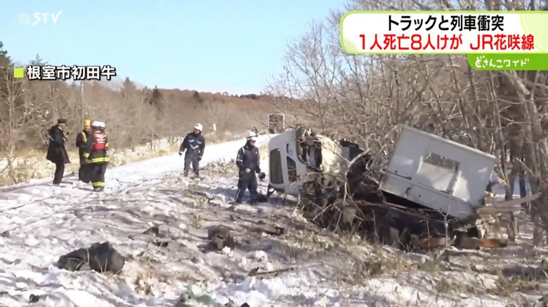圖為事發現場。日本STV報道截圖。 據央視新聞報道,26日上午,日本北海道根室市發生一起列車與卡車相撞事故。當地警方稱,涉事卡車司機被送往醫院後不治身亡。列車上另有8人被送醫,目前均有意識。列車上共有19人,其中包括17名乘客和2名工作人員。警方正在調查事故原因。(完) 【編輯:李雪萍】