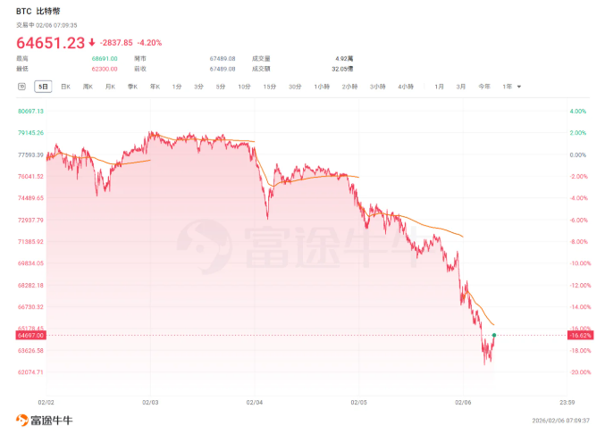 比特幣資產暴跌。(圖源:富途) 交易平台SynFutures首席運營官Wenny Cai指出,清算規模巨大,市場情緒已轉嚮風險規避,價格走勢目前更多由資產負債表機制驅動,而非叙事邏輯。 分析認為,在這一輪大跌的背後,是比特幣的上漲動能、市場叙事以及“避險資產”的標籤幾乎同時瓦解。 Marex Solutions高級全球市場策略師Ilan Solot表示:這基本反映了當前市場的看空情緒,比特幣近期未能發揮避險資產作用,也是原因之一。 據彭博彙編數據,在周一錄得約5.62億美元淨流入後,接下來兩個交易日有超過8億美元資金流出比特幣交易所交易基金(ETF)。CryptoQuant周三報告指出,去年同期購買了46000枚比特幣的美國ETF,在2026年已轉為淨賣出方。 Monarq Asset Management管理合夥人Shiliang Tang表示,加密貨幣市場正在經歷一場“信心危機”。考慮到現任政府曾承諾加強美國在數字資產領域的領導地位,7萬美元被視為重要心理關口。 因此,有部分市場觀察人士指出,隨著7萬美元關口失守,短期可能觸發更大規模拋售。 美股全線重挫 拋售範圍擴大到整個市場 與此同時,隔夜美股、貴金屬市場也遭遇猛烈拋售。截至收盤,標普500指數跌1.23%,報6798.4點;納指跌1.59%,報22540.59點,也是自去年4月以來最嚴重的三日拋售;道瓊斯工業平均指數跌1.2%,報48908.72點。FactSet Research Systems Inc.股價一度暴跌超10%,湯森路透大跌超5%,創2020年3月份以來盤中新低;S&P Global Inc.、Moodys Corp.和Nasdaq Inc.的股價也均明顯走低。亞馬遜、微軟大跌超4%,特斯拉跌超2%,英偉達跌超1%,蘋果、谷歌小幅收跌;台積電ADR逆勢漲超1%,Meta、博通小幅收漲。