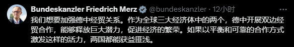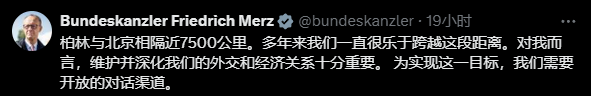 默茨社交媒體網絡截圖 隨後,他又連續發出兩條中文帖文,對德中雙邊合作表達充滿期望。