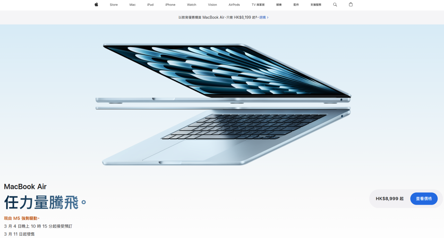 MacBook Air 圖片來源:蘋果官網截圖 據介紹,MacBook Air採用標準版M5芯片,起始存儲容量從256GB翻倍至512GB;MacBook Pro則配備性能更卓越的M5 Pro與M5 Max芯片,採用全新18核CPU架構,性能提升30%;GPU AI峰值算力較上代提升超4倍,光線追蹤性能提升35%。