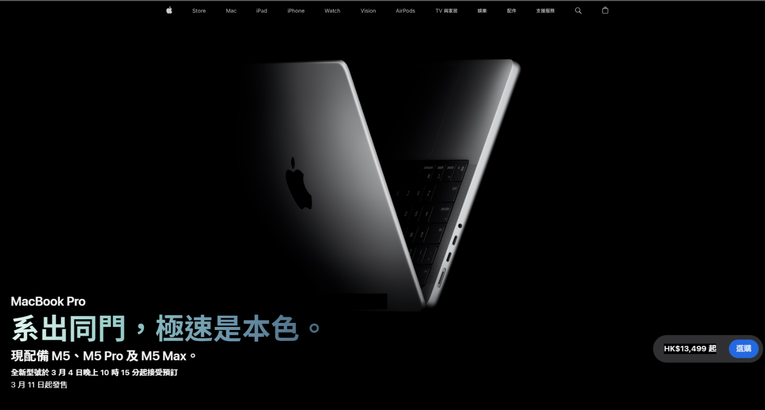 香港中通社3月4日電 美國蘋果公司3日通過官網更新方式,發布搭載全新M5系列芯片的MacBook Pro與MacBook Air。