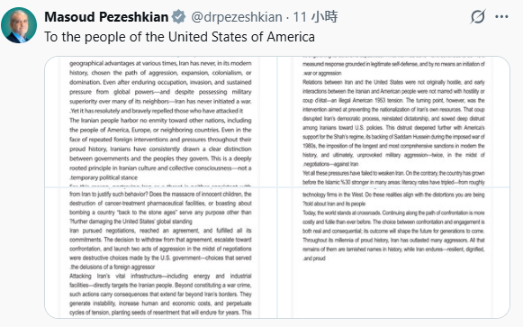 伊朗總統佩澤希齊揚致美國人民的一封公開信 圖片來源:佩澤希齊揚社媒截圖 報道說,佩澤希齊揚在公開信中質疑美國究竟是真正奉行“美國優先”,還是僅僅充當“以色列的代理人”。 佩澤希齊揚在信中說,將伊朗描繪成威脅既不符合歷史現實,也不符合現今可觀察的事實。這種認知是強權政治與經濟意願的產物,他們需要炮製一個敵人,以此為施壓、維持軍事霸權、支撐軍工產業以及控制戰略市場尋找借口。 佩澤希齊揚說,襲擊伊朗包括能源和工業設施在內的關鍵基礎設施,直接針對的是伊朗人民。此類行徑不僅構成戰爭罪,其後果更遠超伊朗國界。 另據伊朗學生通訊社2日凌晨報道,伊朗外交部發言人巴加埃表示,伊朗方面已通過包括巴基斯坦在內的中間人收到信息,但並未與美國直接談判。美方的要求“過分且不合理”。 巴加埃表示,對伊朗人民而言,最重要的是抵禦侵略,伊朗已做好應對任何形式攻擊的準備,包括地面進攻。 伊朗國防部發言人表示,對美國和以色列的反擊行動目標包括獲得賠償或等效的破壞、美軍從該地區撤離、徹底摧毀針對伊朗的美軍基地,以及確保不再對伊朗及該地區發動戰爭。(完) 【編輯:林曉惠】