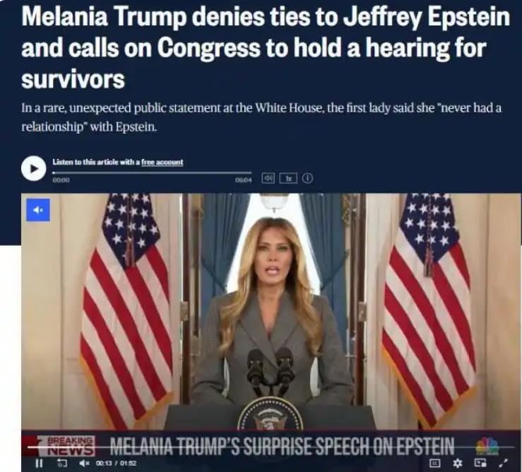 圖片來源:美國全國廣播公司(NBC)報道截圖 梅拉尼婭還說:“我不是愛潑斯坦的受害者。愛潑斯坦並沒有把我介紹給唐納德·特朗普。1998年,我在紐約市的一個派對上偶然遇到了我的丈夫。”梅拉尼婭表示,她第一次與愛潑斯坦見面是在2000年,當時她與特朗普一同出席一場活動。“此前我從未見過愛潑斯坦,對他的犯罪活動也一無所知”。 梅拉尼婭稱,多年來,社交媒體上流傳的有關她和愛潑斯坦的圖片和言論“完全是捏造的”,自己並非與愛潑斯坦任何罪行相關的證人或指定證人。“我對愛潑斯坦虐待受害者的行為一無所知。我從未以任何身份參與其中。” 愛潑斯坦與大批美國政商名流往來密切,因涉嫌性犯罪被捕後,於2019年8月在獄中死亡,並被判定為“自殺”。2025年底,美國司法部開始在其網站公布愛潑斯坦案文件。文件中大量提及前總統克林頓。(完) 【編輯:李彥洲】