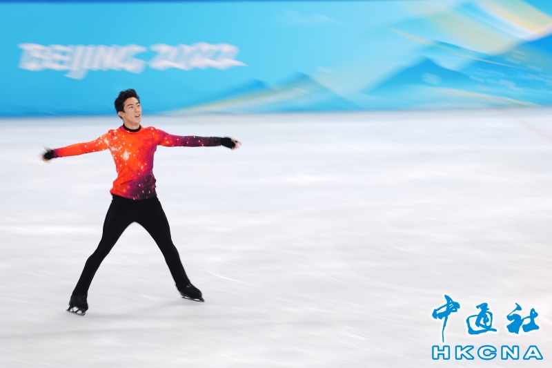 •   2月10日,北京2022年冬奧會花樣滑冰男子單人滑自由滑比賽在首都體育館舉行。美國選手陳巍奪得冠軍。圖為陳巍比賽中。 香港中通社圖片