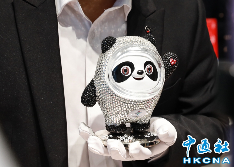 •   2月14日,鑽石版“冰墩墩”樣品亮相河南鄭州冬奧特許零售店,進行為期三天的展示。據了解,鑽石版“冰墩墩”高約16cm,底座直徑約10cm。全身鑲鑽2700餘顆,限量發行2022個。圖為工作人員直播展示鑽石版“冰墩墩”。 香港中通社圖片