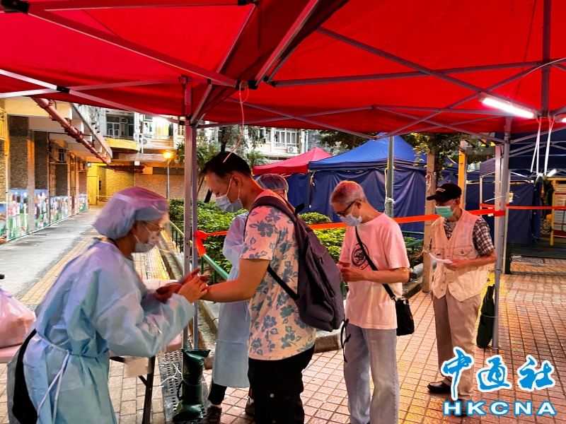 •   5月14日上午約8時15分,香港特區政府完成葵涌安蔭邨德蔭樓強制檢測行動,約1660名人士接受檢測,其中發現1宗陽性檢測個案,衛生防護中心正安排跟進。圖為稅務局工作人員為受檢人士佩戴手環以證明接受強制檢測。 香港中通社圖片