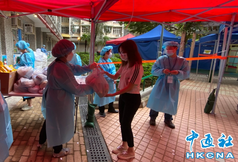 •   5月14日上午約8時15分,香港特區政府完成葵涌安蔭邨德蔭樓強制檢測行動,約1660名人士接受檢測,其中發現1宗陽性檢測個案,衛生防護中心正安排跟進。圖為稅務局工作人員向受檢人士派發食物包及由中央政府捐贈的抗疫中成藥。 香港中通社圖片