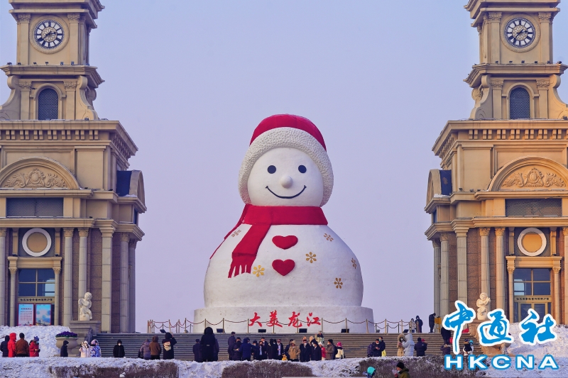 哈爾濱:18米高“超治愈”大雪人亮相松花江畔