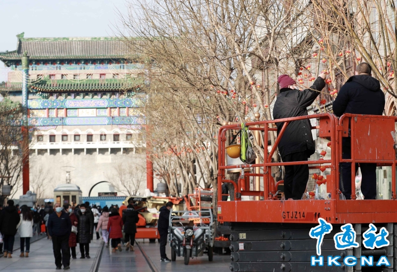 •   1月7日,北京前門大街,工作人員懸掛燈籠。春節臨近,北京街頭年味漸濃。 香港中通社圖片