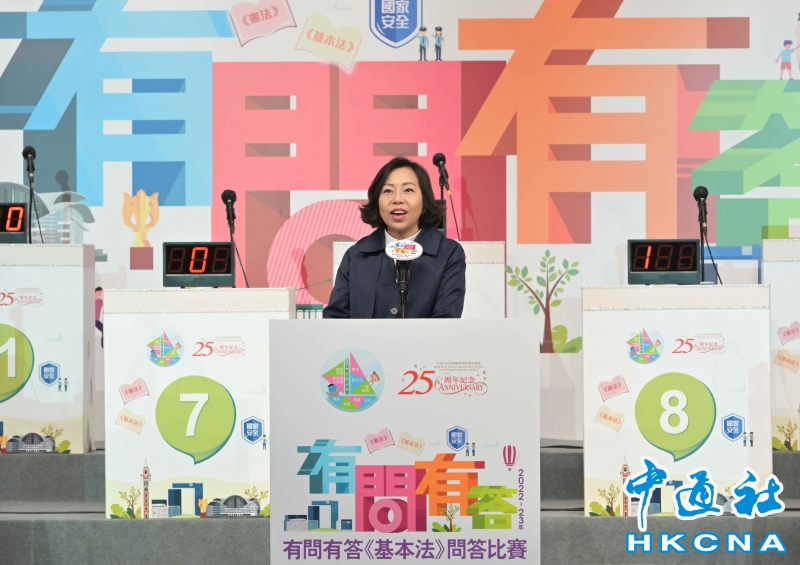 •   香港特區民政及青年事務局局長麥美娟3月11日在“有問有答《基本法》問答比賽”決賽暨頒獎禮上致辭。 香港中通社圖片
