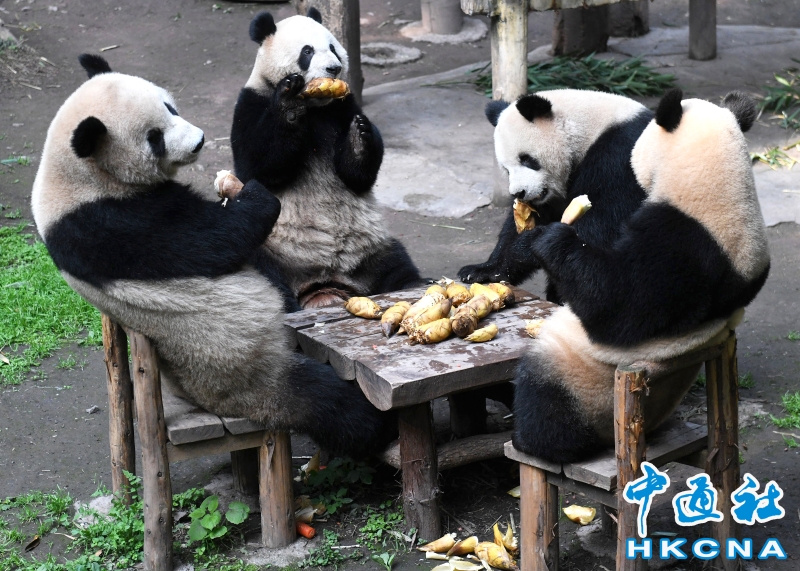 •   3月15日,重慶動物園四只大熊貓享用美食,萌態十足。這四只大熊貓分別是“雙雙”“重重”“喜喜”“慶慶”,它們坐在餐凳上,圍著餐桌享用竹笋、胡蘿蔔、蘋果等美食。 香港中通社圖片