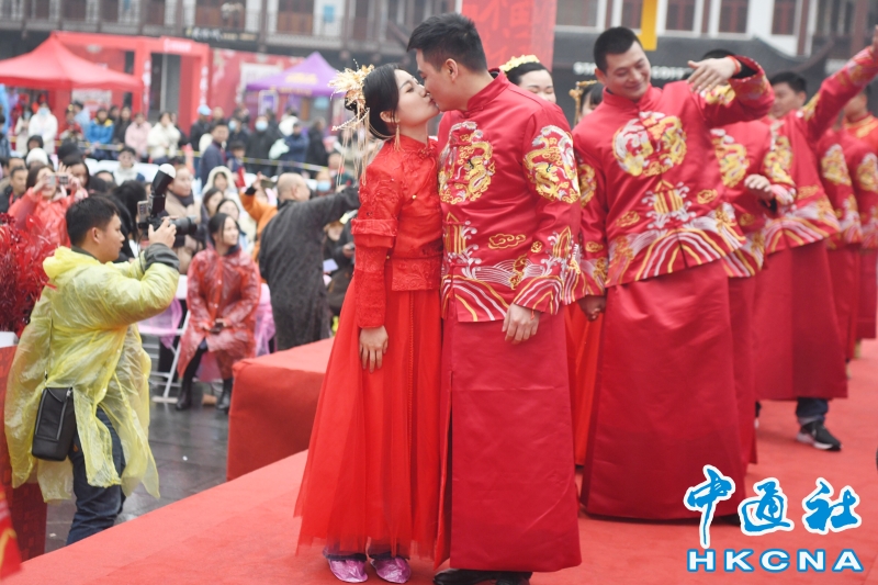 •   3月19日,新人在紅毯上親吻。當日,湖南省第四屆國潮集體婚禮在張家界武陵源舉行,100對新人在奇峰秀水的見證下締結良緣。 香港中通社圖片