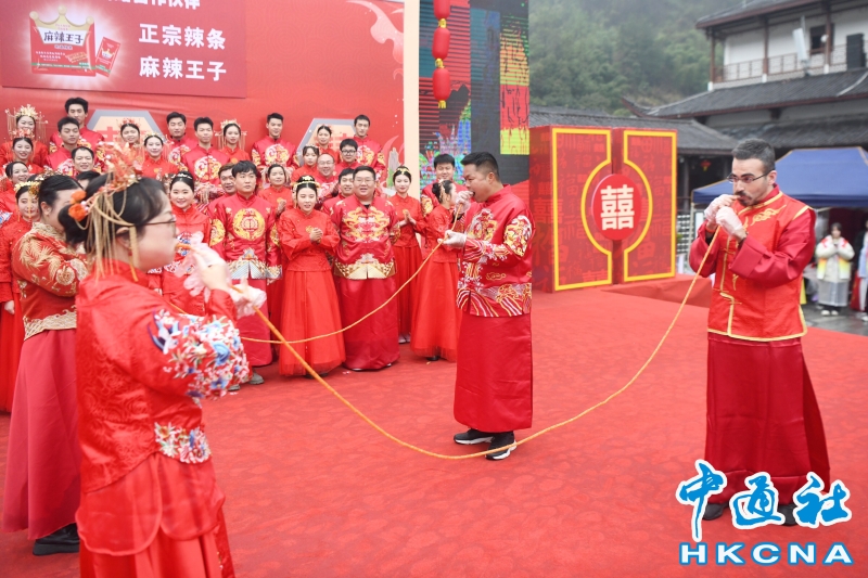 •   3月19日,新郎和新娘共吃5.2米辣條。當日,湖南省第四屆國潮集體婚禮在張家界武陵源舉行,100對新人在奇峰秀水的見證下締結良緣。 香港中通社圖片