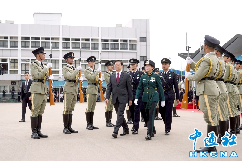 •   香港海關學員結業會操24日舉行。圖為香港特區行政長官李家超(前排左)和海關關長何珮珊(前排右)檢閱會操隊伍。 香港中通社圖片