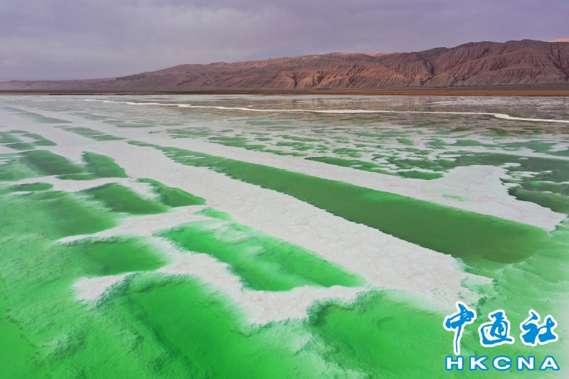 •   3月29日,航拍位於柴達木盆地的青海省海西蒙古族藏族自治州茫崖市翡翠湖。該翡翠湖面積約26平方公里,屬於硫酸鎂亞型鹽湖。 香港中通社圖片