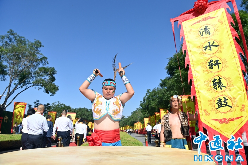 •   6月22日,“2023(癸卯)年公祭中華人文始祖伏羲大典”在甘肅省天水市伏羲廣場舉行。同一時刻,海峽兩岸共祭中華人文始祖伏羲典禮在台灣新北市舉行。這是兩岸連續第十年跨海連線、異地同時舉行祭祀伏羲活動。圖為活動現場擊鼓迎賓。 香港中通社圖片