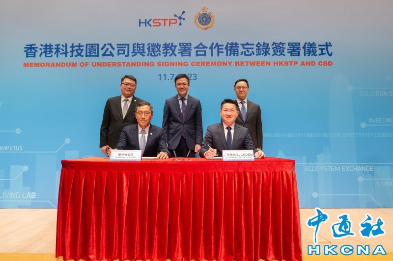 •   香港懲教署與香港科技園公司7月11日簽訂合作備忘錄,深化雙方合作關係,為推動“智慧監獄”的持續發展注入新動能。合作備忘錄由懲教署副署長(行動及策略發展)吳超覺(前排右)和科技園公司行政總裁黃克強(前排左)共同簽署,並由創新科技及工業局局長孫東教授(後排中)、懲教署署長黃國興(後排右)和科技園公司主席查毅超博士(後排左)共同見證。 香港中通社圖片