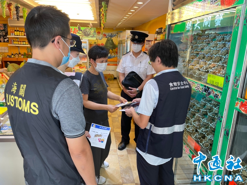 •   香港海關與食物環境衞生署食物安全中心及環境衞生部自上周五(9月15日)展開聯合執法行動,於各區大閘蟹零售點進行巡查,以確保市面上出售的大閘蟹符合相關的法例規定及要求,保障消費者權益和食物安全。圖為海關和食環署人員巡查大閘蟹零售店和派發相關宣傳單張。 香港中通社圖片
