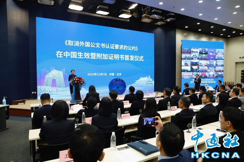 •   《取消外國公文書認證要求的公約》11月7日在中國生效實施。中國外交部當天在北京舉行《公約》在中國生效暨附加證明書首發儀式。 香港中通社圖片