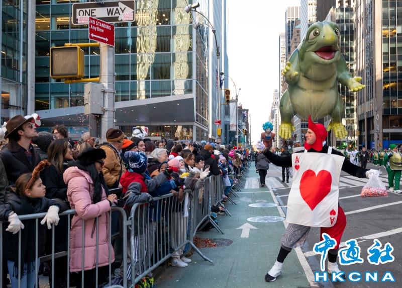 •   當地時間11月23日,第97屆梅西百貨感恩節大遊行在美國紐約曼哈頓舉行。圖為小醜團隊演出人員與圍觀民眾互動。 香港中通社圖片