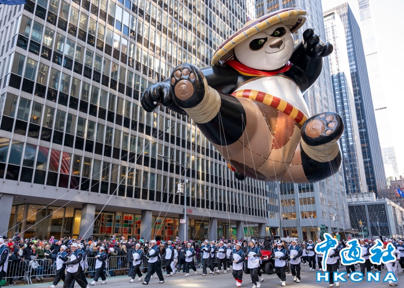 •   當地時間11月23日,第97屆梅西百貨感恩節大遊行在美國紐約曼哈頓舉行。圖為基於動畫電影《功夫熊貓》裡阿寶的造型設計的巨型氣球行進在曼哈頓街頭。 香港中通社圖片