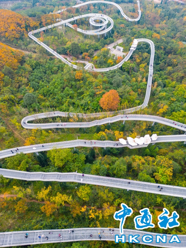 •   11月29日,四川成都,無人機俯瞰龍泉山城市森林綠道高空棧道。這條剛開放的高空棧道以“浪漫愛情”為主題,依龍泉山而建,似“漂浮”於森林之上,一直綿延蜿蜒到山頂。 香港中通社圖片