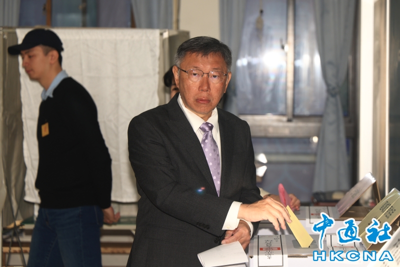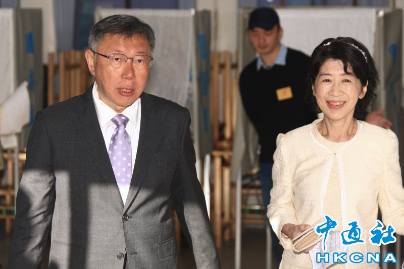 •   台灣大選1月13日舉行投票。台灣民眾黨大選候選人柯文哲(右)到台北大安區一投票所投票。(香港中通社記者 許其皓攝) 香港中通社圖片