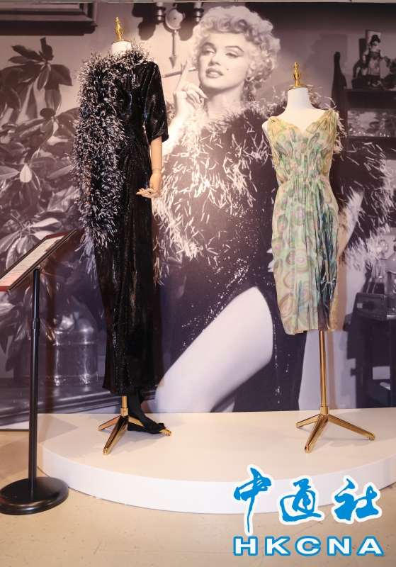 “譜寫傳奇:《花花公子》休·海夫納 x 瑪麗蓮·夢露”將於1月 27日至2月1日在香港中環藝穗會開展,免費展出瑪麗蓮·夢露和《花花公子》創立人休·海夫納的逾50件珍貴藏品。瑪麗蓮·夢露於電影《七年之癢》中所穿的黑色玻璃紙效果晚禮服(左)、瑪麗蓮·夢露於1960年夏天出席電影《亂點鴛鴦譜》劇組新聞發布會時所穿的米色絲質針織雞尾酒裙(右)。(香港中通社記者 曹文毓攝) 香港中通社圖片