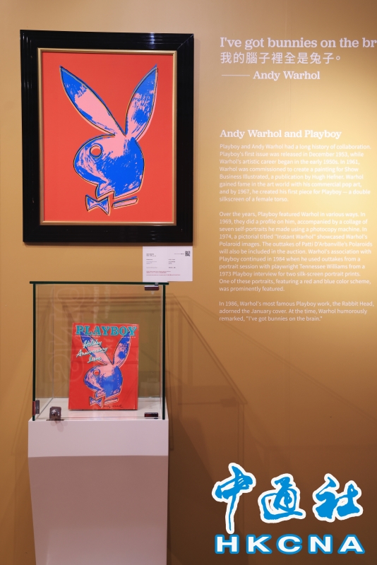 “譜寫傳奇:《花花公子》休·海夫納 x 瑪麗蓮·夢露”將於1月 27日至2月1日在香港中環藝穗會開展,免費展出瑪麗蓮·夢露和《花花公子》創立人休·海夫納的逾50件珍貴藏品。圖為安迪·沃霍爾《花花公子兔女郎》絲網版畫原作。(香港中通社記者 曹文毓攝) 香港中通社圖片